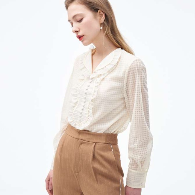 エレガントな印象を与えるフリル襟デザインシャツブラウス