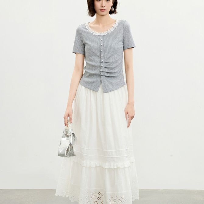 胸元に白いレースフリルをあしらった半袖トップスです。