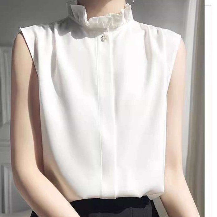 スタンドカラーに施された繊細なフリルが魅力的なノースリーブブラウスです。