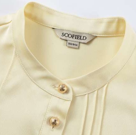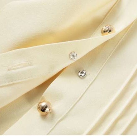上品な光沢感と金色のボタンが高級感を引き立て、オフィスからフォーマルシーンまで幅広く活躍する一着です。