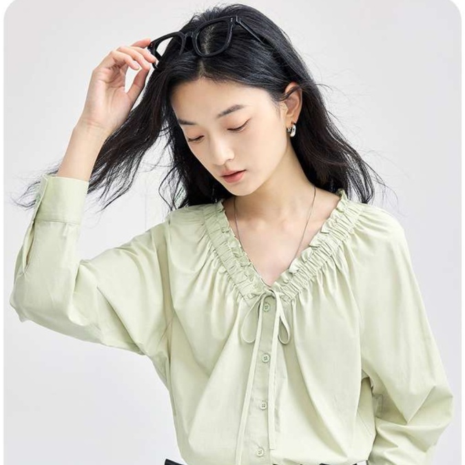 デニムと合わせてカジュアルにもきれいめにも着こなせる万能アイテムで、リボン調の襟元がさりげない上品さを演出します。