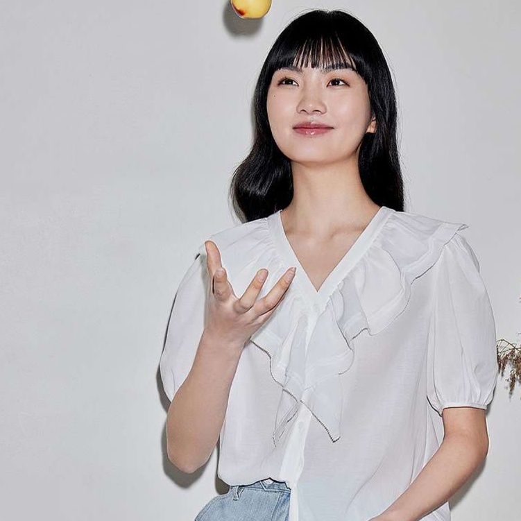 胸元のたっぷりとしたフリルが女性らしさを引き立て、程よい透け感のある素材感が上品な印象を与えます。