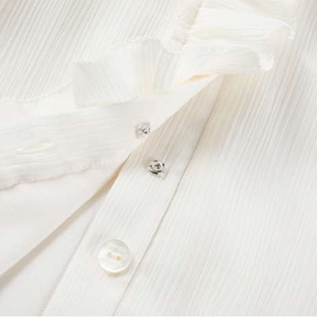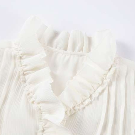 優美な印象を与えるフリルブラウス。首元にあしらわれた繊細なフリルが女性らしさを引き立てます。