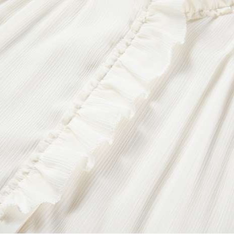 首元のふんわりとしたフリルが女性らしい優美な印象を演出
