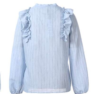 なめらかな生地感の前立てボタン付きフリルブラウス。肩から胸元にかけて贅沢なフリルをあしらい、フェミニンな印象を演出。
