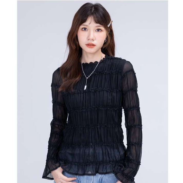 透け感のある生地にたっぷりギャザーを寄せた、上品なフリルブラウス。