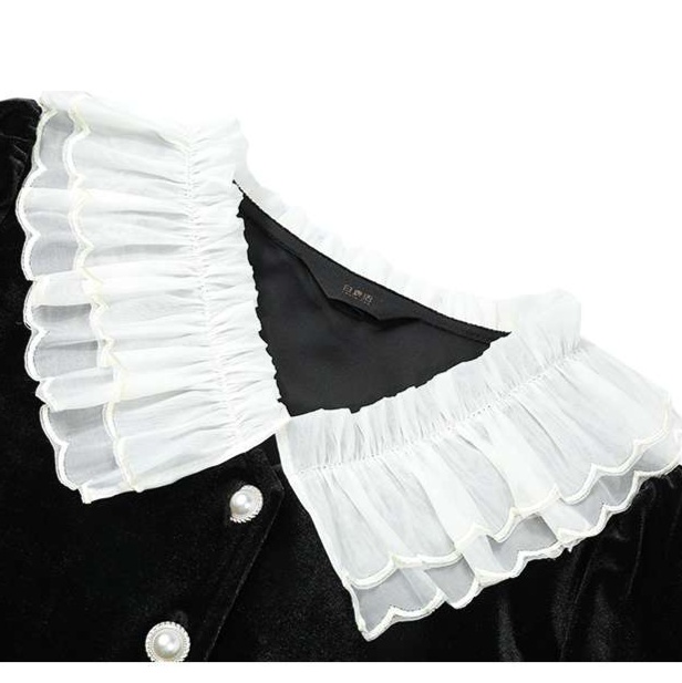 贅沢な襟のデザインと袖口のフリル装飾が清楚で優美な雰囲気を演出。