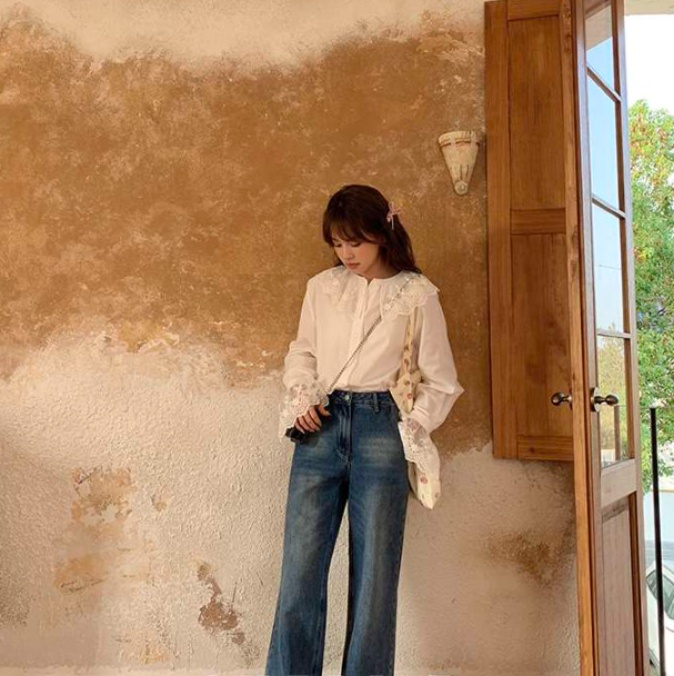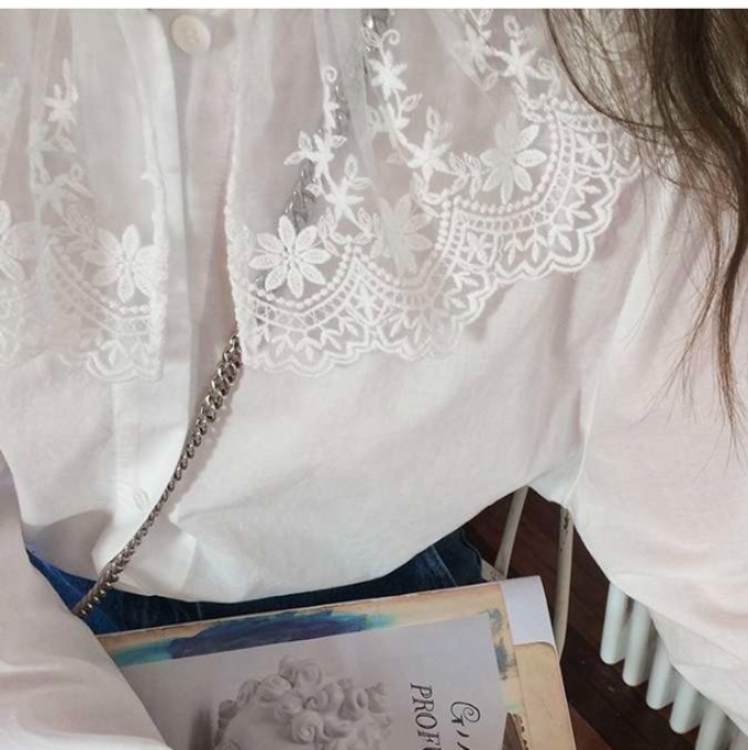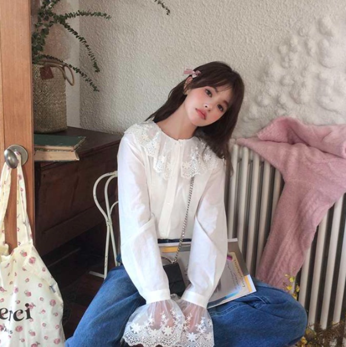 優雅な花柄レース襟が印象的なフリルブラウス。袖には同デザインのレースフリルを施し、クラシカルで洗練された雰囲気を醸し出す。デイリーコーデに華やかさをプラスし、フォーマルシーンでも活躍する万能アイテム。コーディネートの幅が広がる一着。