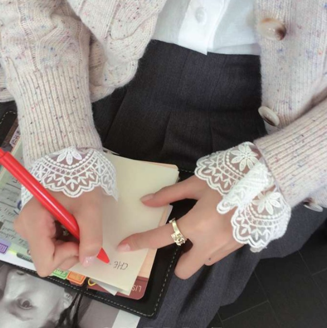 襟元と袖口の花柄レースが上品で華やかな印象を演出
