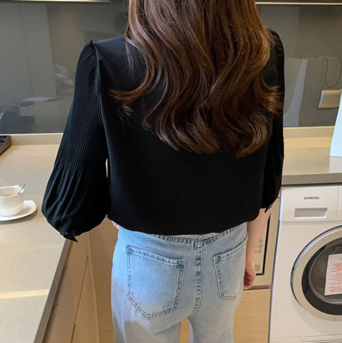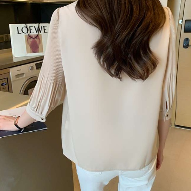 襟元のフリルデザインが上品な雰囲気を演出するフリルブラウス。プリーツ加工された袖とフリルの組み合わせが、女性らしさを引き立てます。胸元のフリルは揺れ動きで表情豊かな印象を与えます。オフィスシーンでも活躍する一着です。