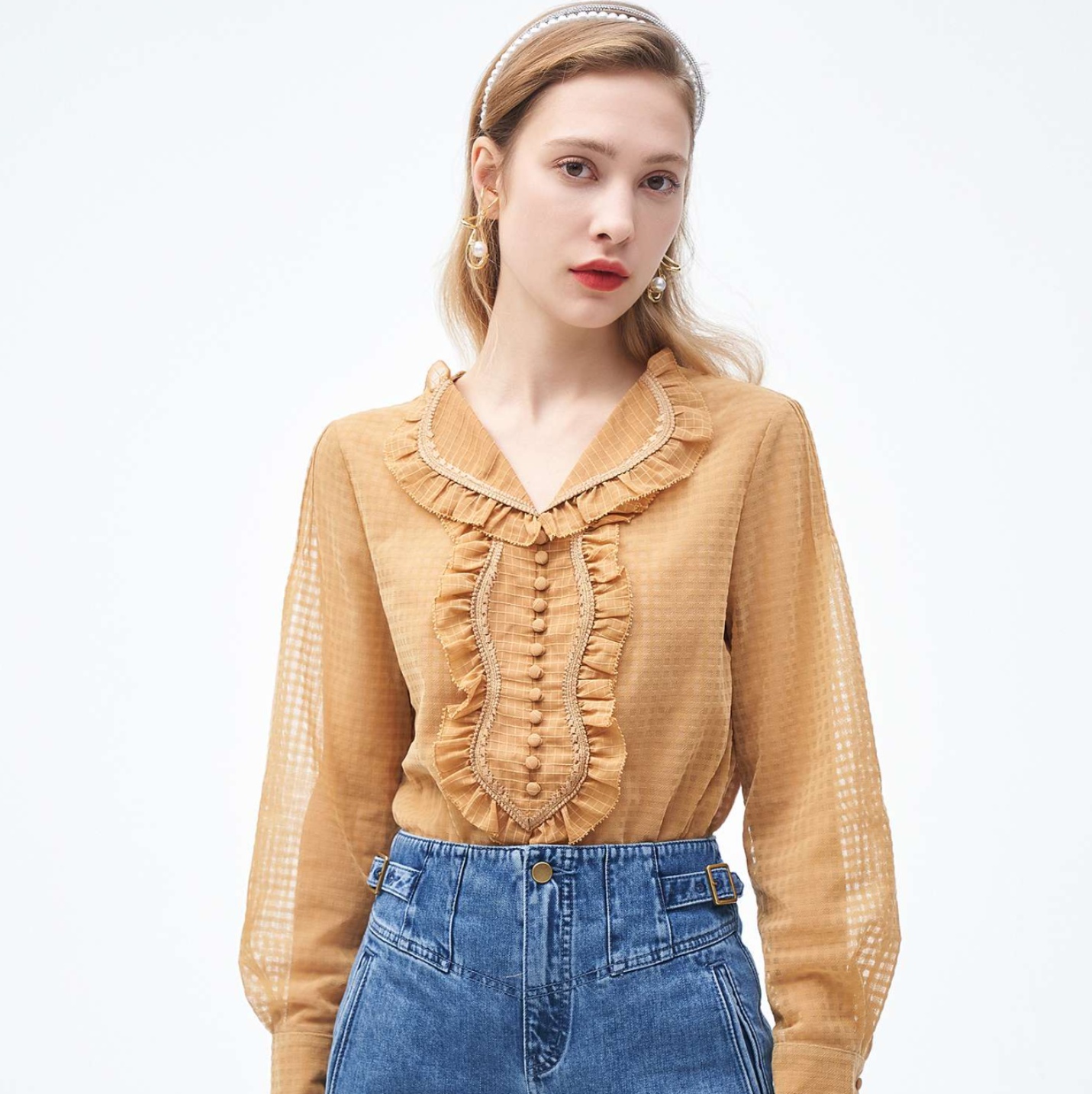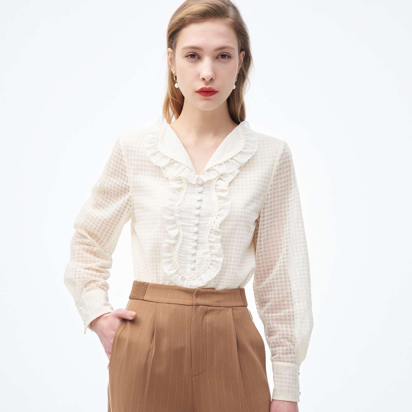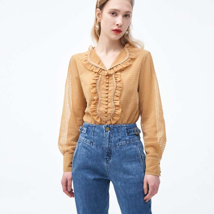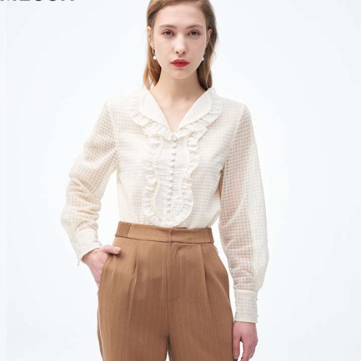 クラシカルな雰囲気漂う、上品な襟元にあしらわれたフリルが特徴的なフリルブラウス。