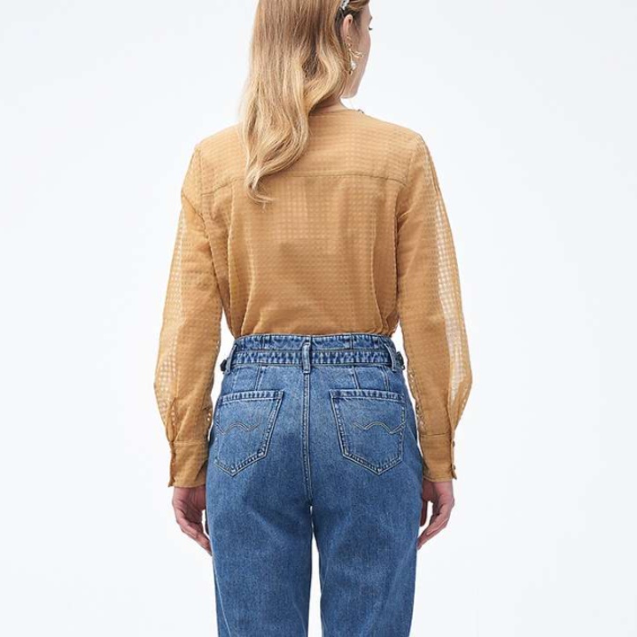 胸元に施された真珠調の小ぶりなボタンが華やかさを添える