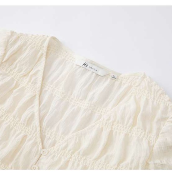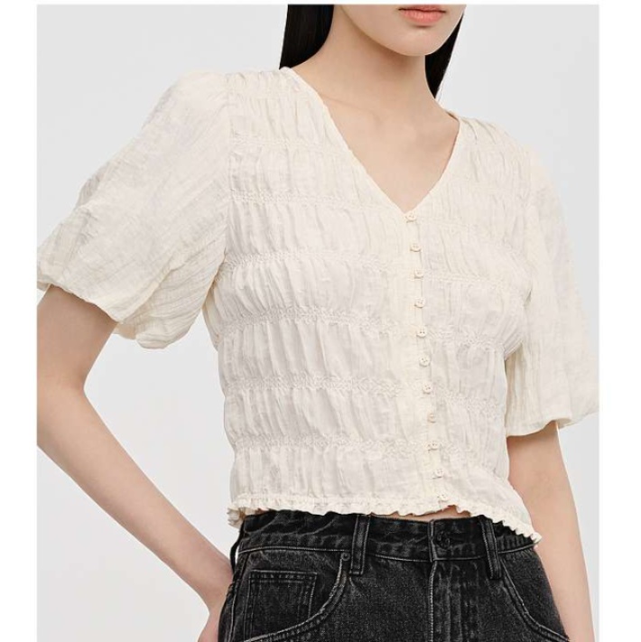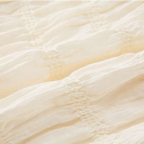 全体に施されたシャーリング加工が立体的な表情を生み、上品な雰囲気を演出