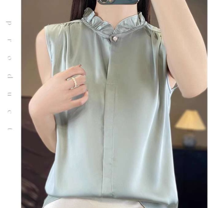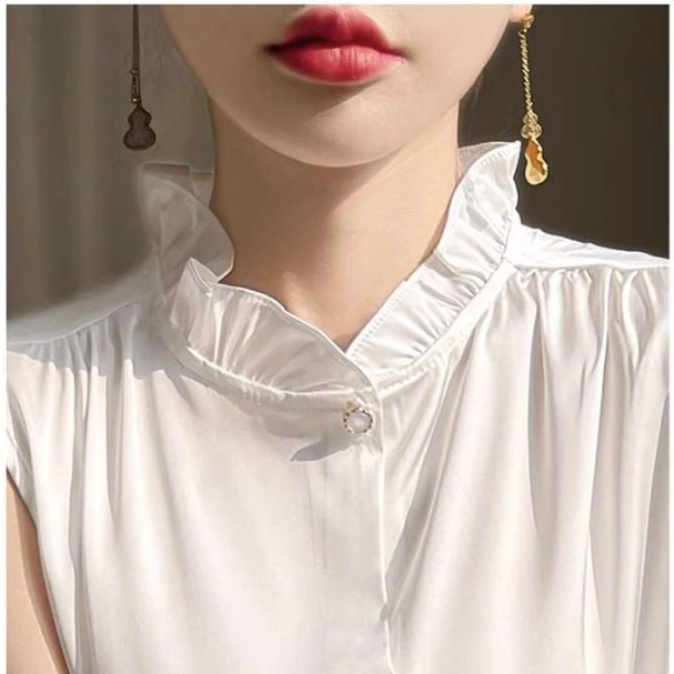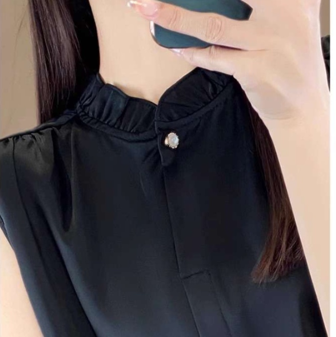 しなやかな生地感が魅力のフリルブラウス。首元に施された華やかなフリルデザインと控えめなパールボタンが、上品さを引き立てる一着。ノースリーブスタイルは、オフィスシーンからカジュアルなお出かけまで幅広く対応し、着る人の魅力を引き出します。シンプルながらも存在感のあるデザインで、あなたのコーディネートを格上げするアイテムです。