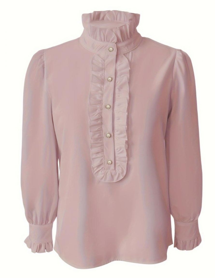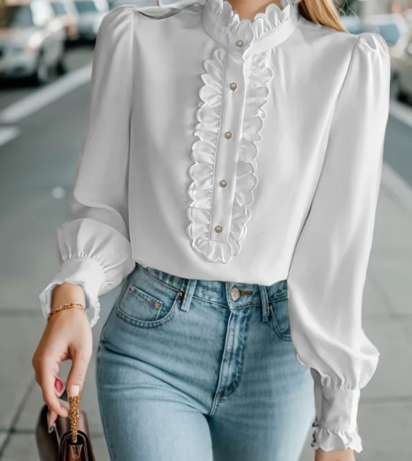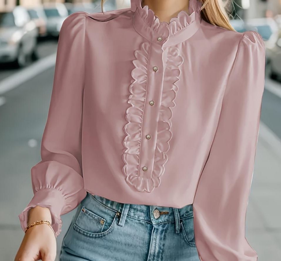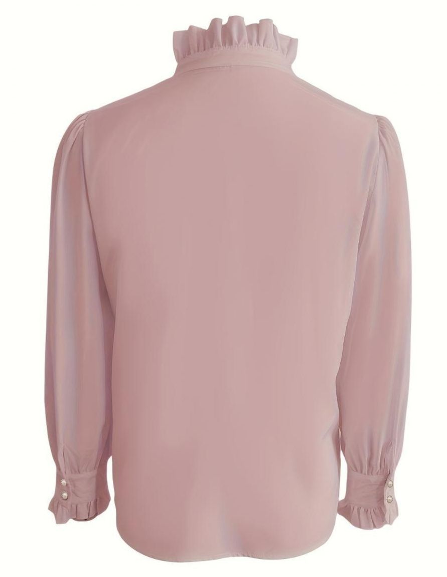 胸元フリルが華やかな印象を与えるフリルブラウスです。