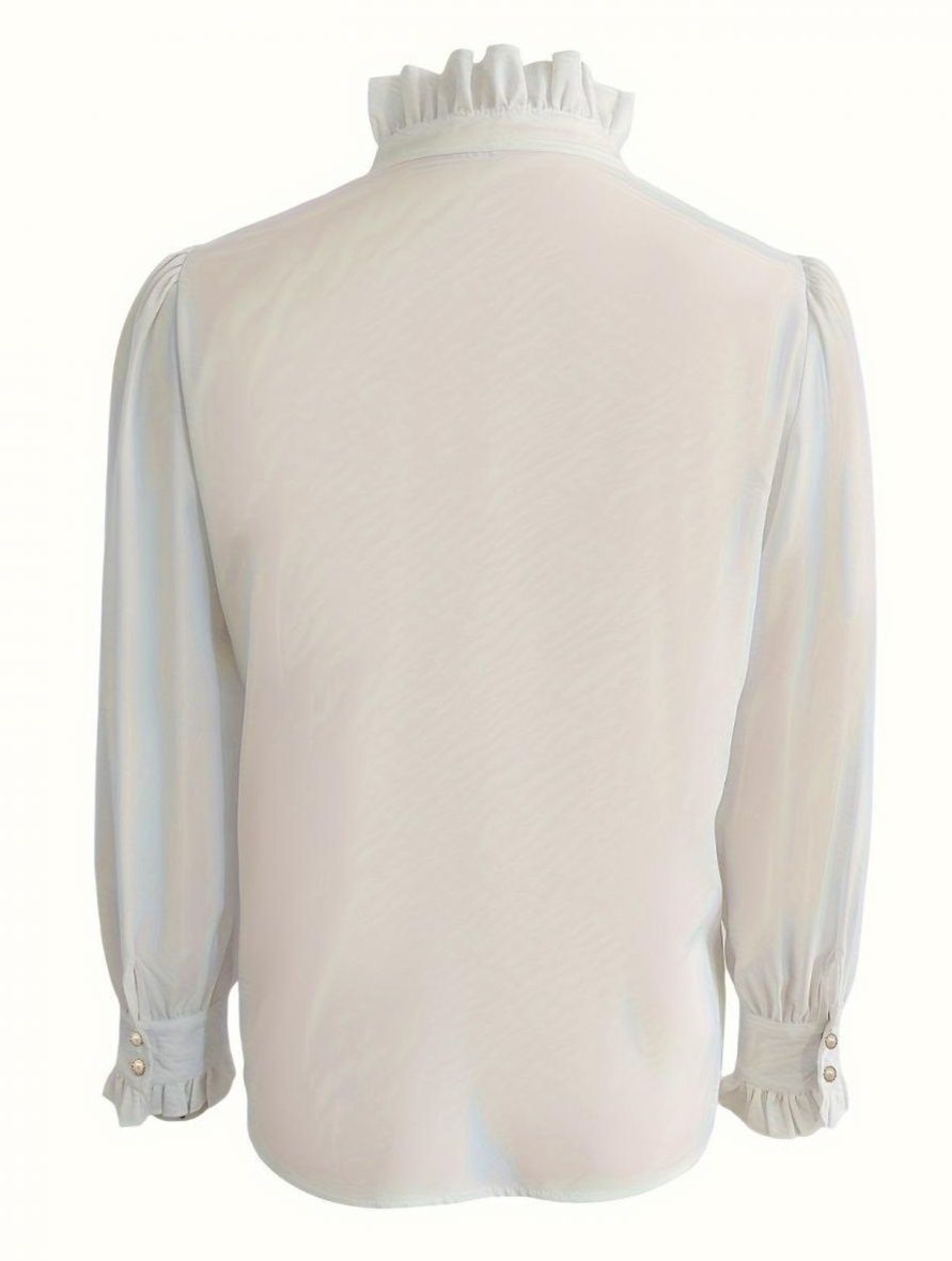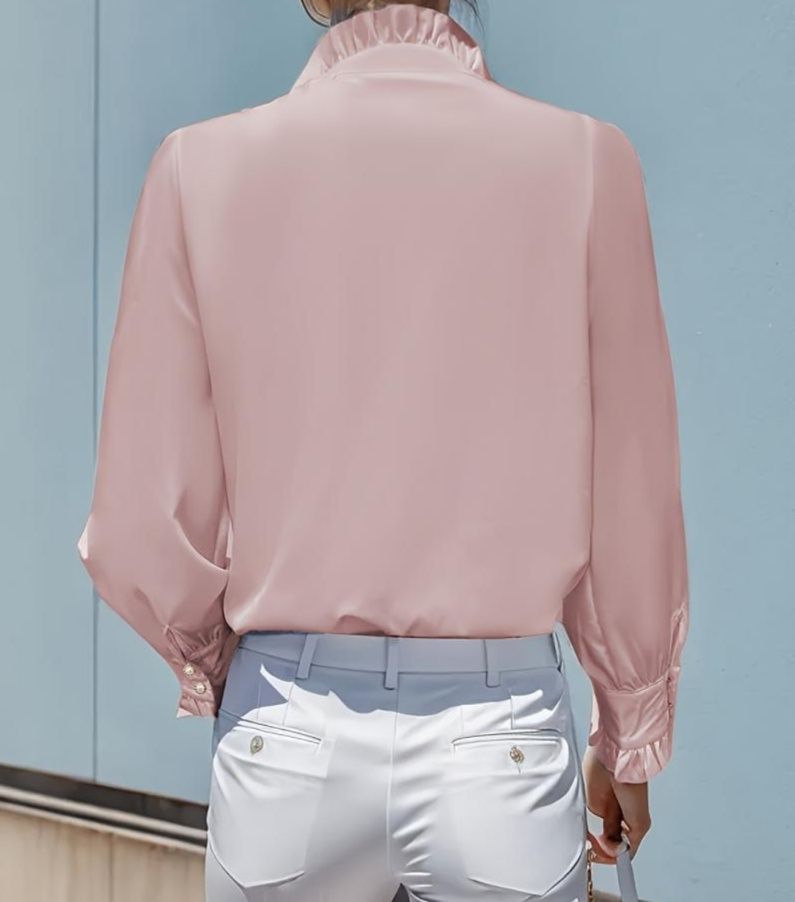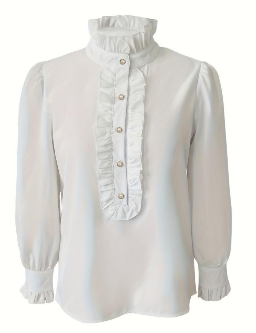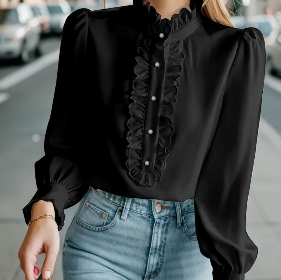 胸元フリルが華やかな印象を与えるフリルブラウスです。