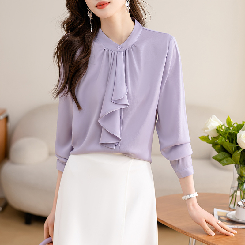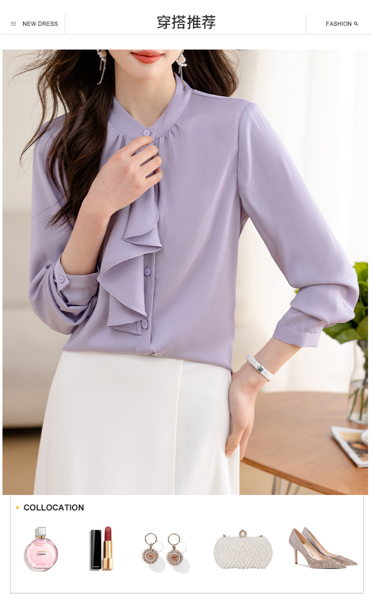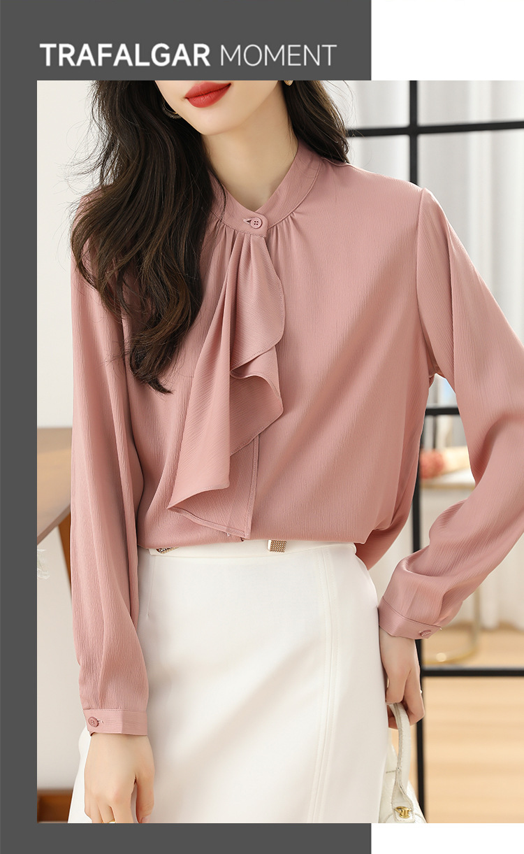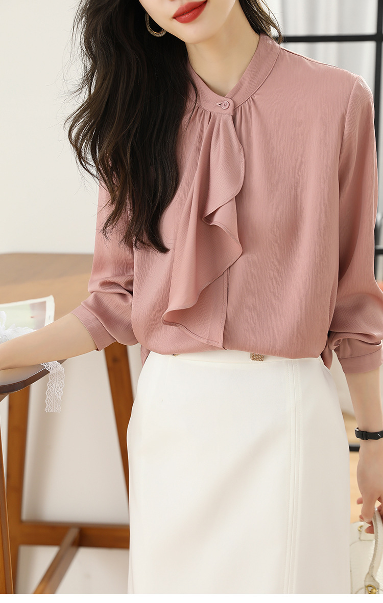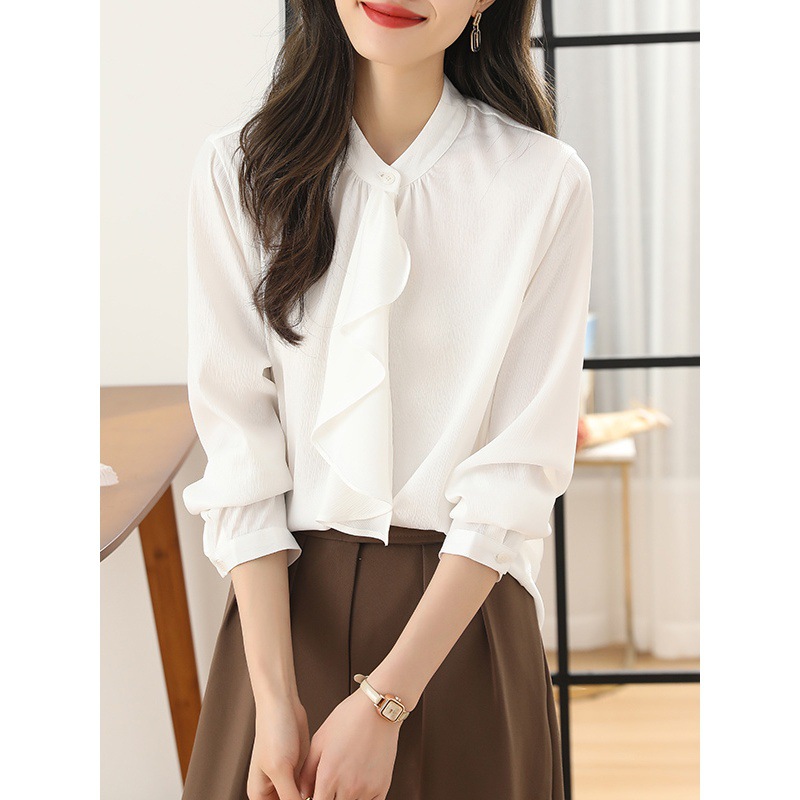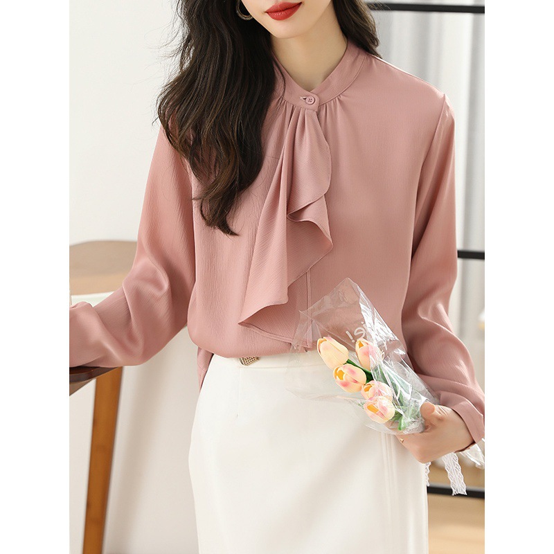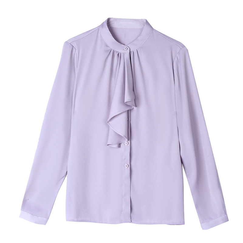エレガントな胸元のフリルが印象的なフリルブラウスです。