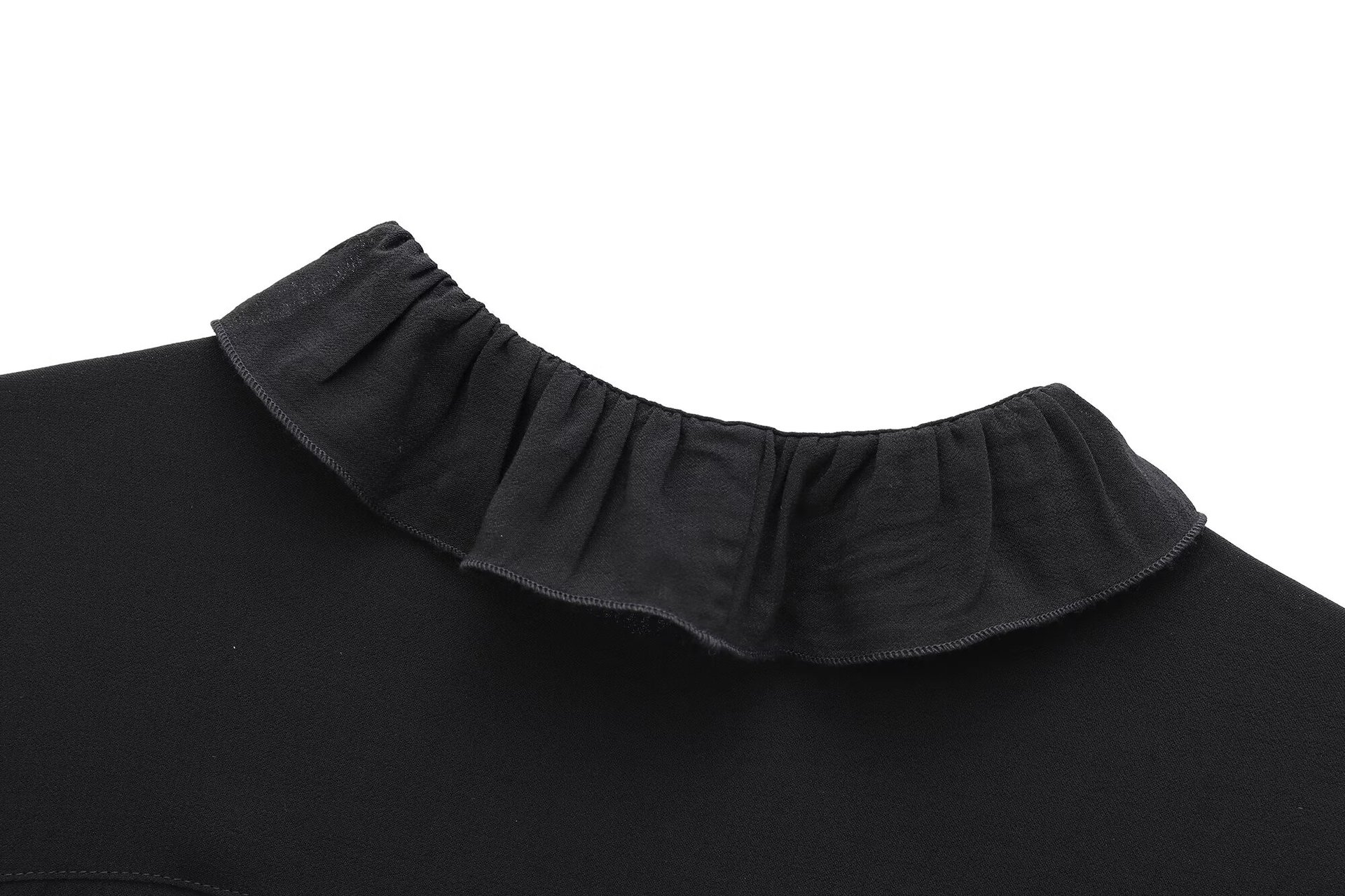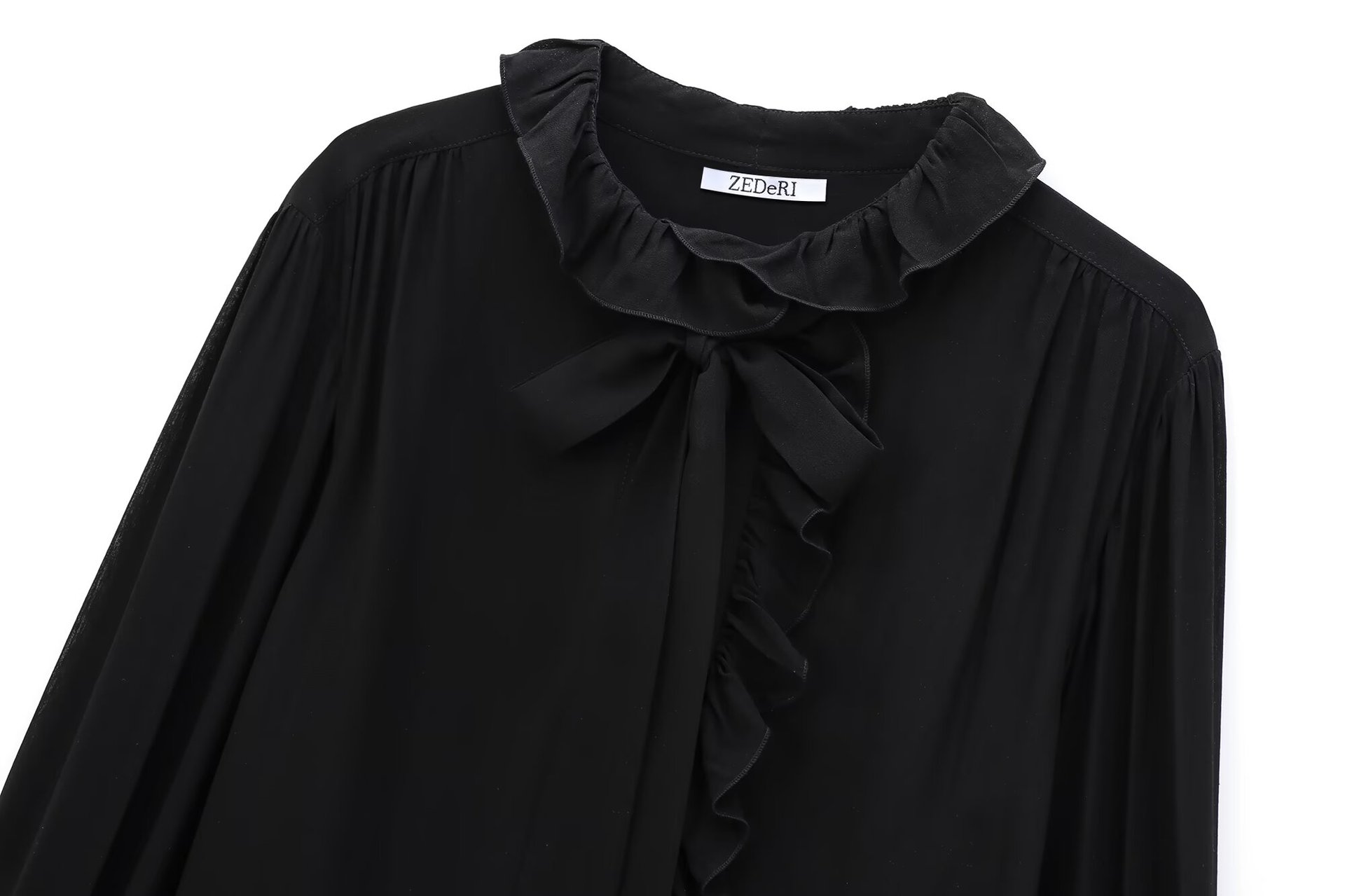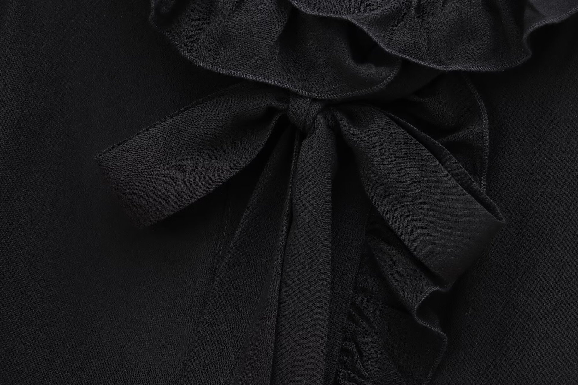 首元の襟フリルは優雅な雰囲気を演出し、胸元のリボンタイがアクセントになっています。