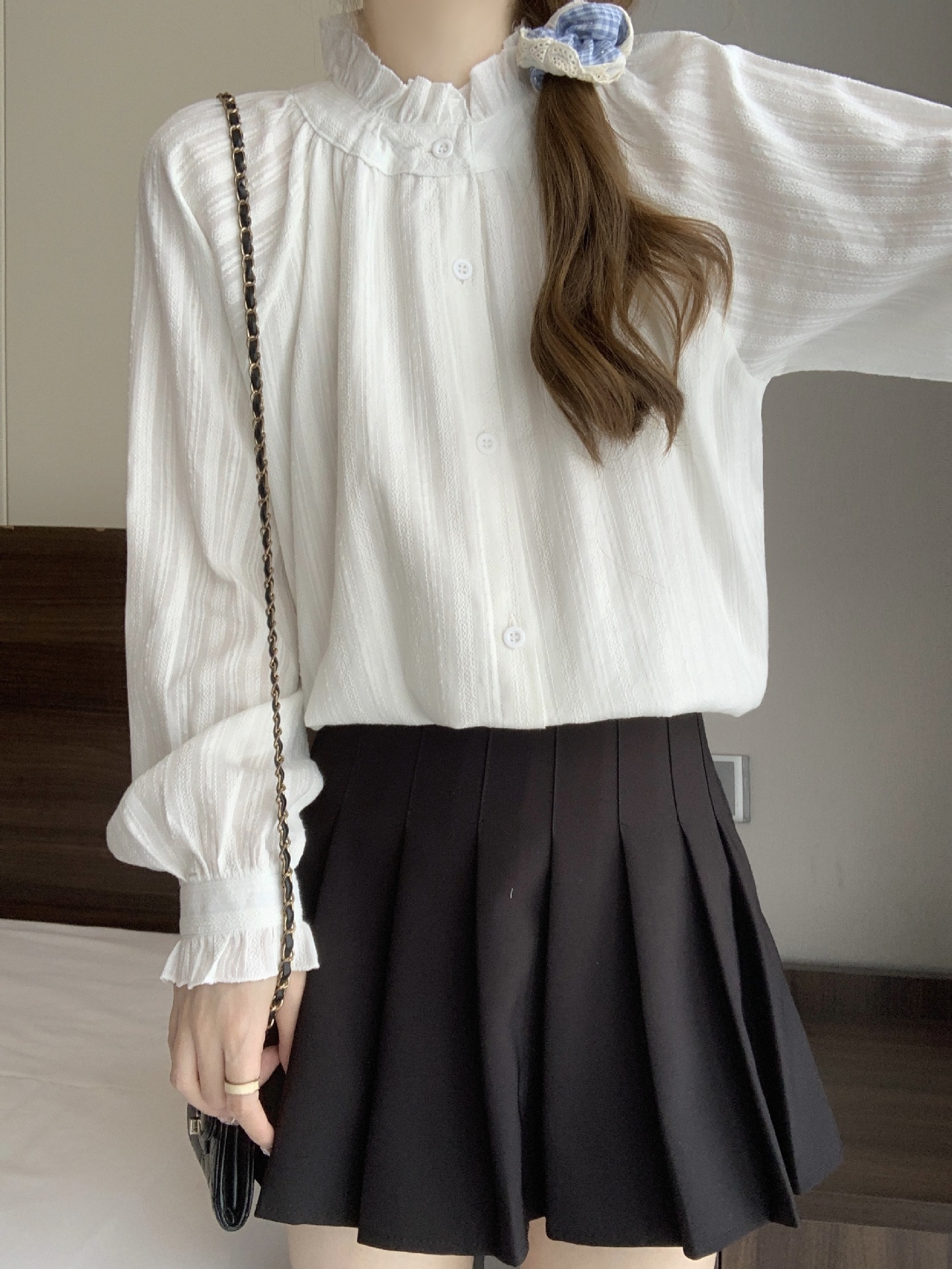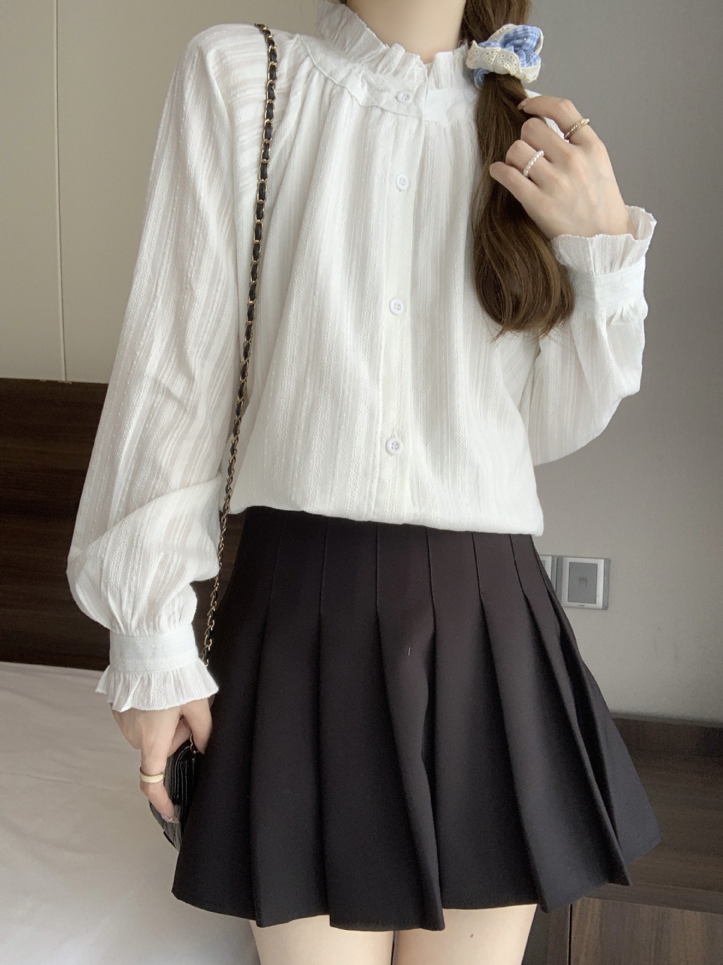 首回りに施された細やかなギャザーフリルが上品で女性らしい印象を演出します。