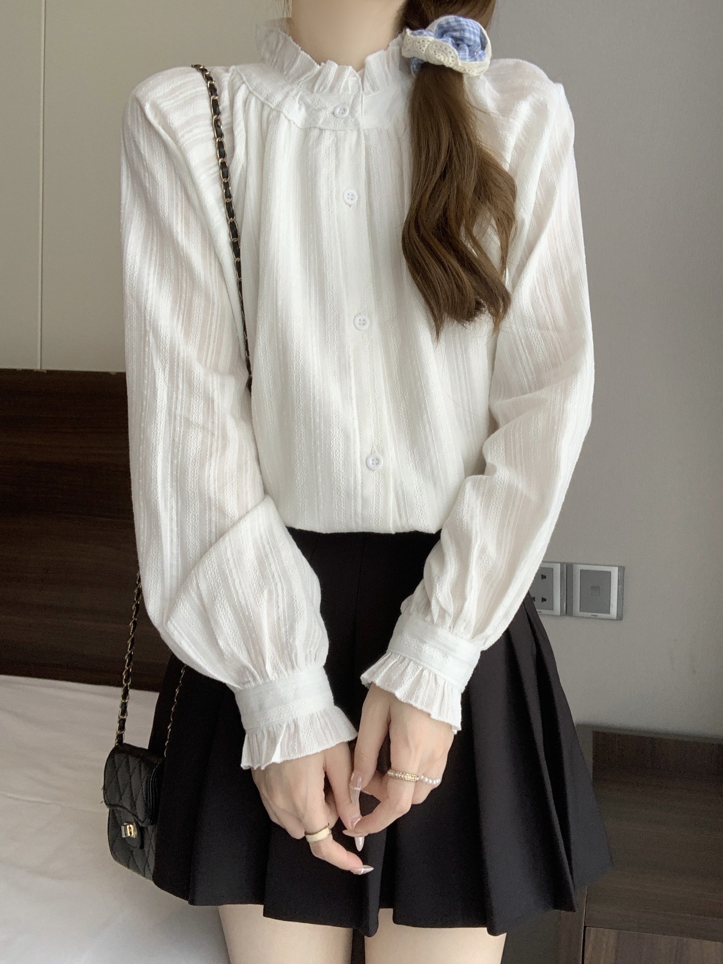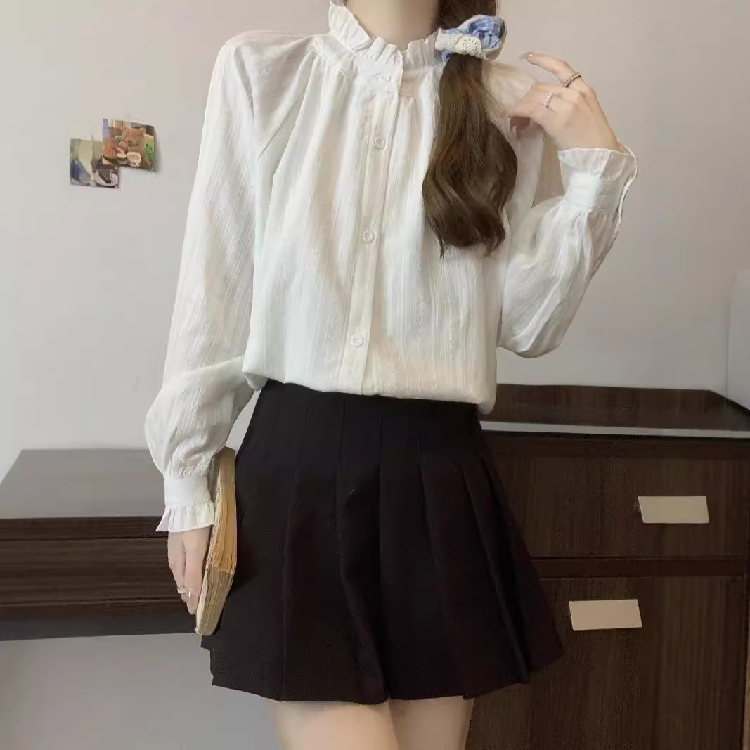 襟元を華やかに彩る襟フリルが魅力のフリルブラウスです。