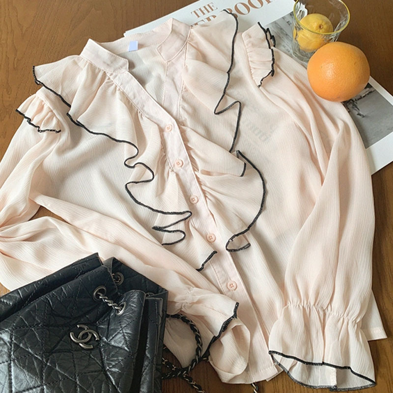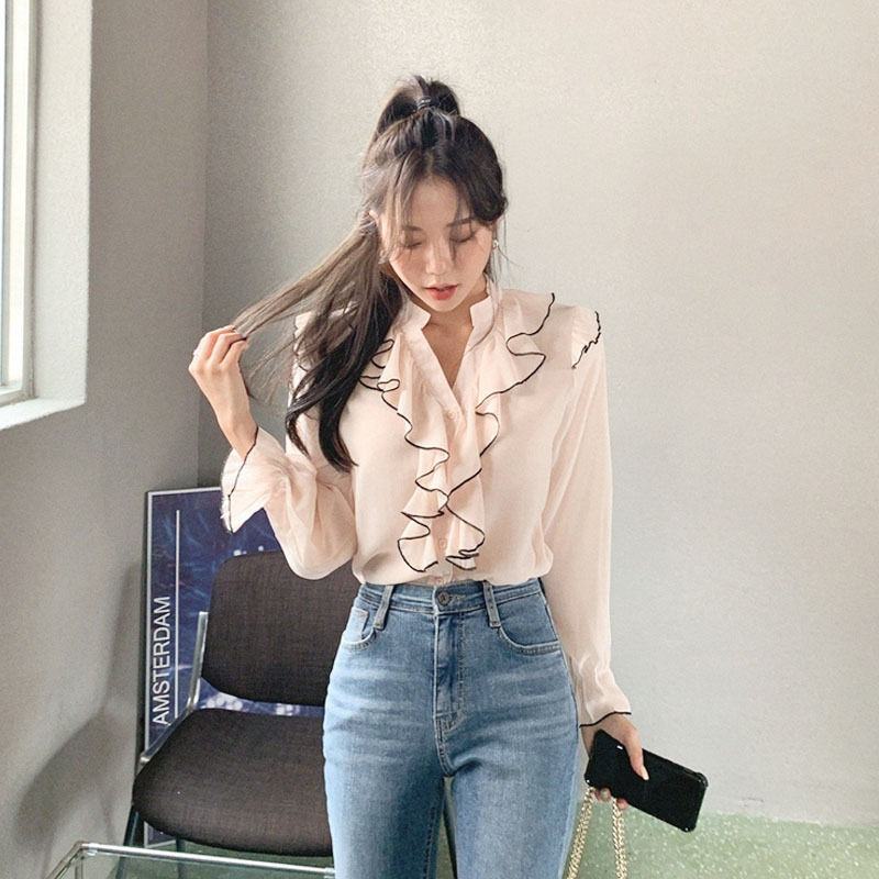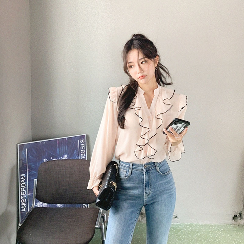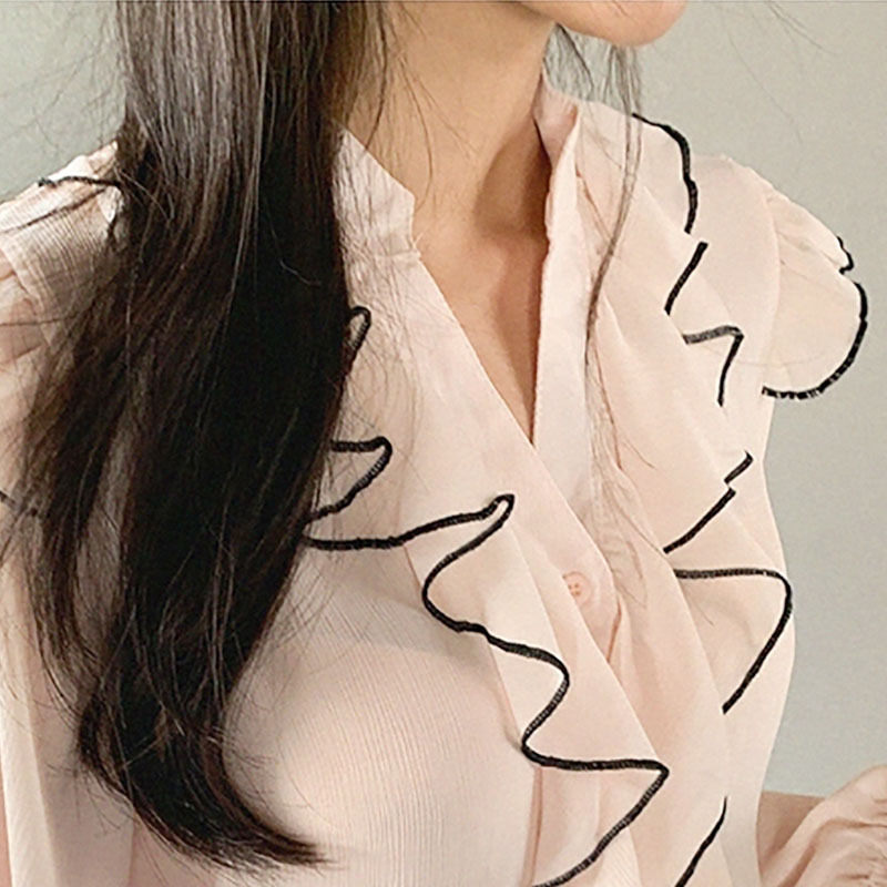 胸元を華やかに彩る波型のフロントフリルが印象的なフリルブラウスです。