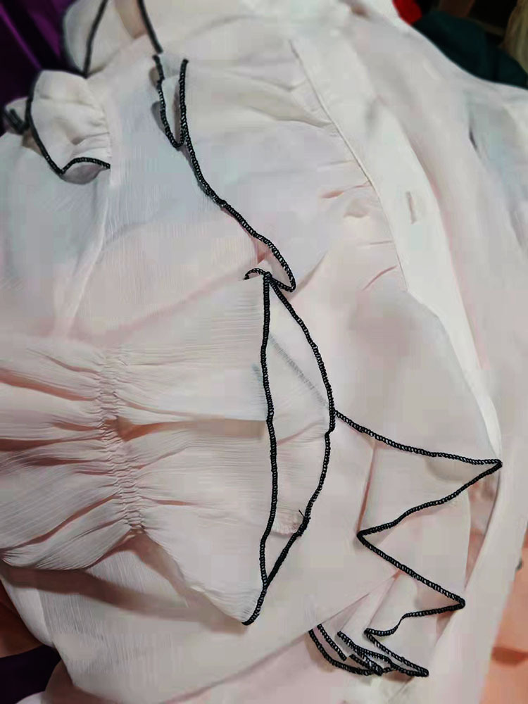 フリルの縁取りに施された配色パイピングがアクセントとなり、上品さと可愛らしさを両立させています。