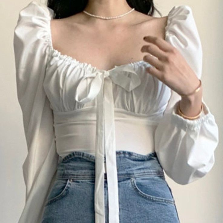 胸元のギャザーとリボンが可憐な印象を演出するフリルブラウスです。