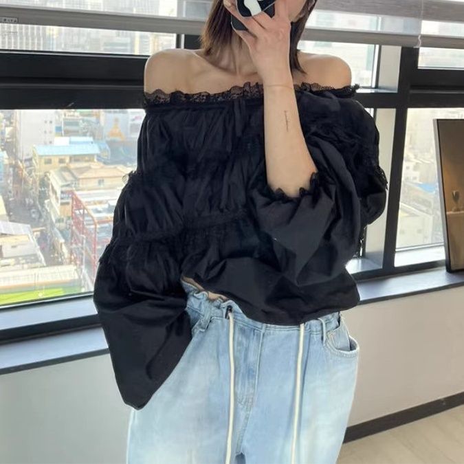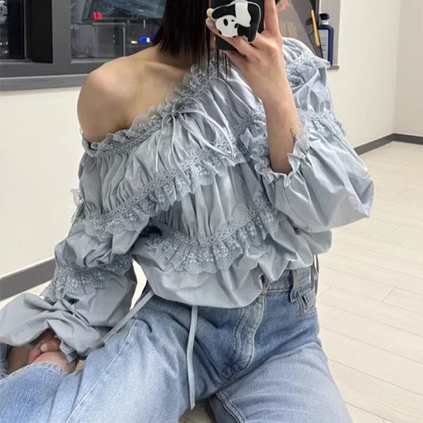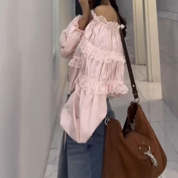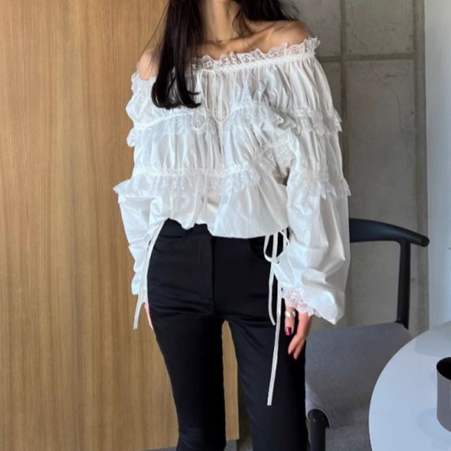 華やかな胸元フリルが魅力のフリルブラウスです。 肩を美しく見せるオフショルダーデザインに、三段のティアードフリルをあしらった贅沢な一枚。 袖口のリボンディテールがフェミニンさを演出し、繊細なレースの縁取りが上品な印象を与えます。 カジュアルにもきれいめにも着回せる万能アイテムで、デイリーからお出かけまで幅広くご活用いただけます。 女性らしさを引き立てる特別な一着です。