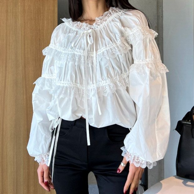袖口のリボンディテールがフェミニンさを演出し、繊細なレースの縁取りが上品な印象を与えます。