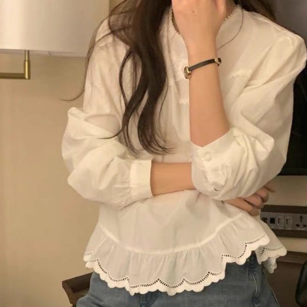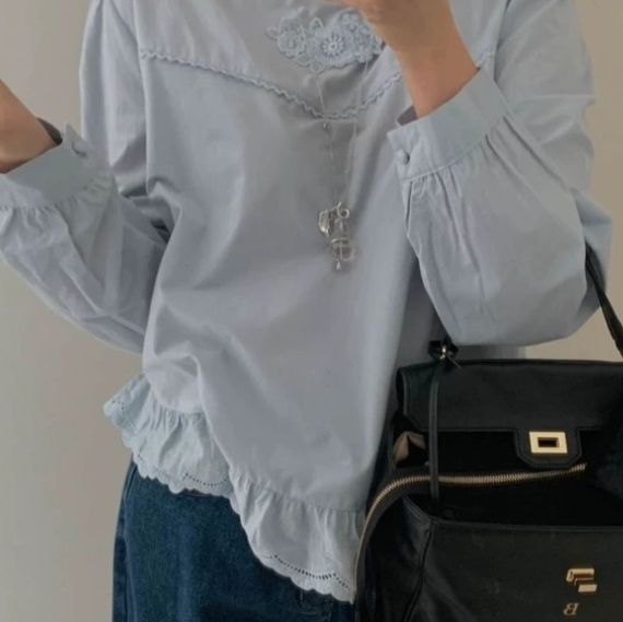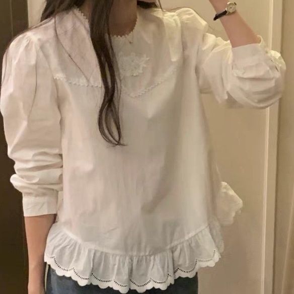 裾のスカラップ刺繍が可愛らしいフリルブラウスです。 裾 フリルには繊細な透かし模様が施され、女性らしさを演出します。 ふんわりとしたパフスリーブと丸襟のデザインが優しい印象を与え、カジュアルからきれいめまで幅広く着こなせます。 裾のギャザーフリルが動くたびに揺れ、軽やかで上品な雰囲気を醸し出します。 一枚でコーディネートの主役になる、デイリー使いに最適なアイテムです。