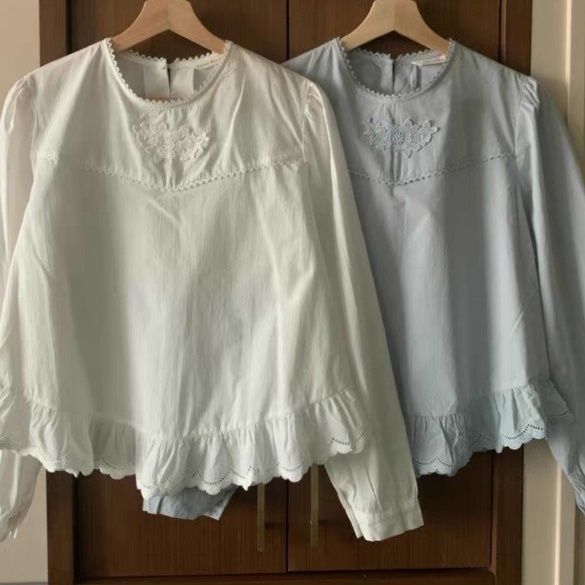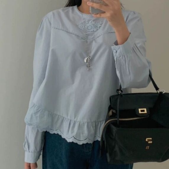 裾のスカラップ刺繍が可愛らしいフリルブラウスです。
