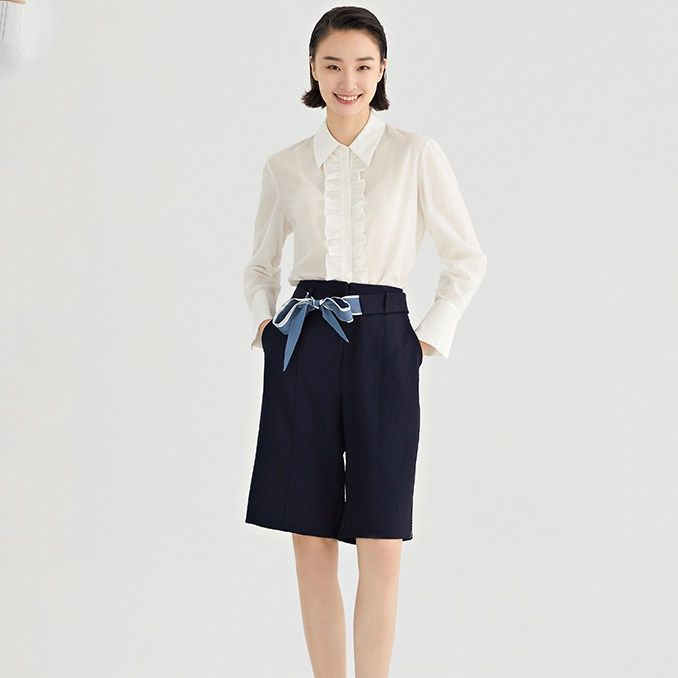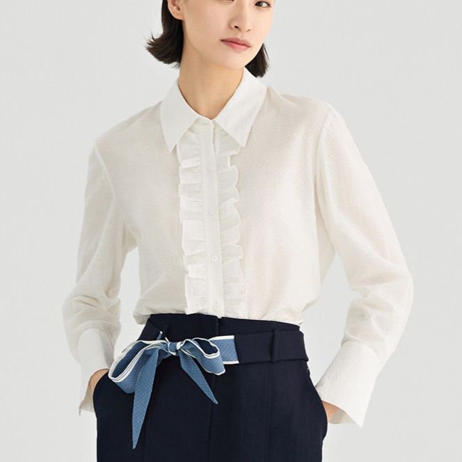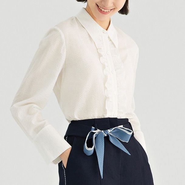 胸元を飾るフロントフリルがクラシカルな雰囲気を演出し、きちんと感のある襟元が通勤やオフィスシーンにも最適です。