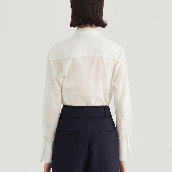 女性らしさと知的な印象を両立させた、大人のためのブラウスです。