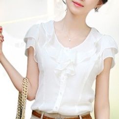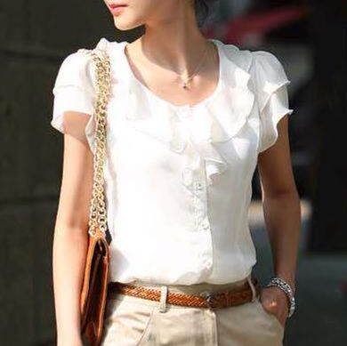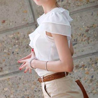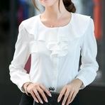 胸元から肩にかけてフリルが華やかな印象を演出するフリルブラウスです。