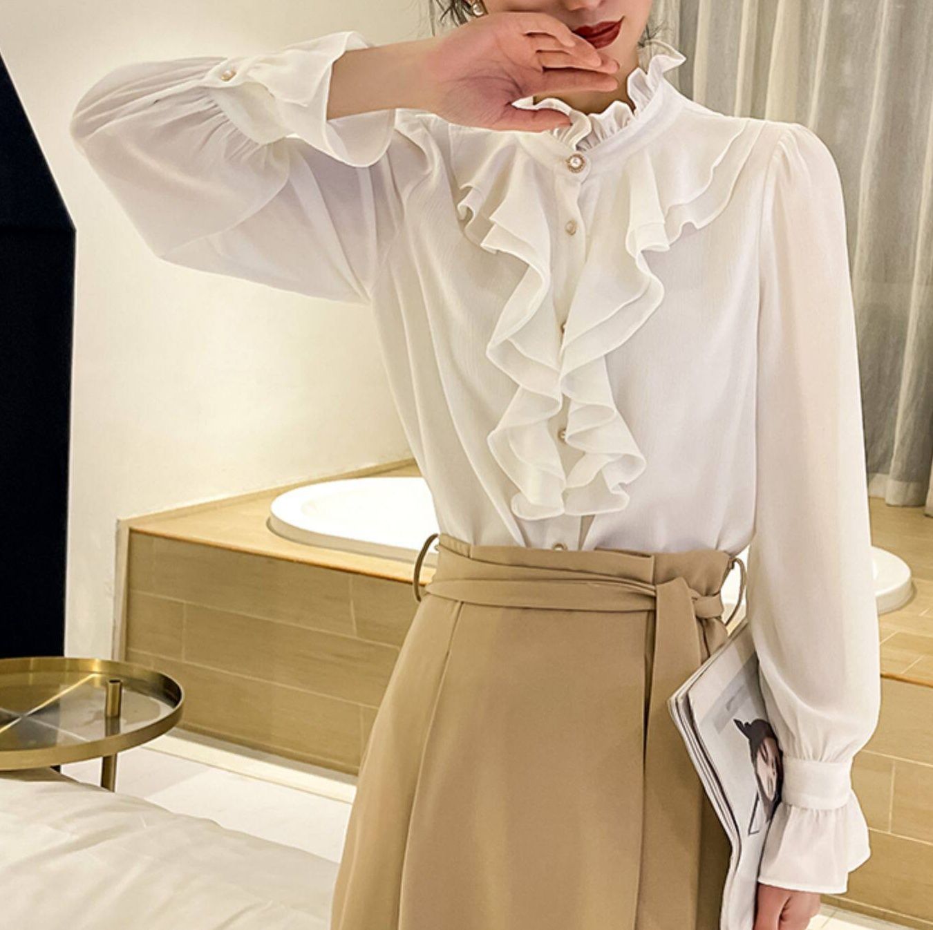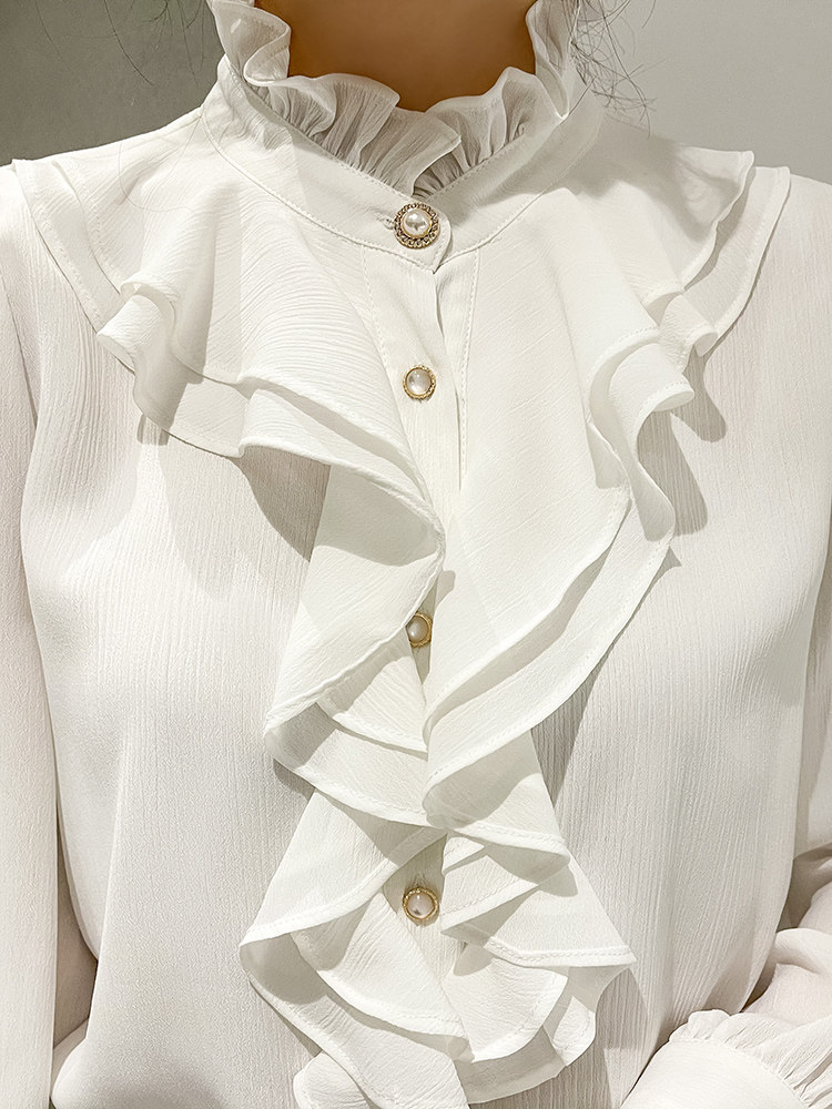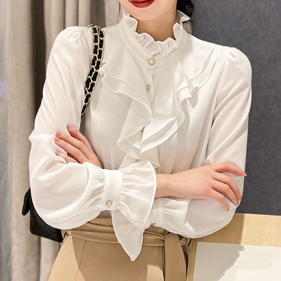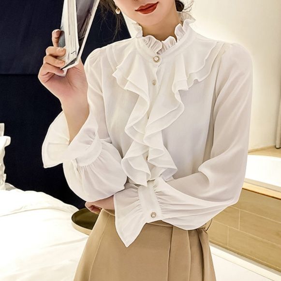 胸元を華やかに彩るフロントフリルが魅力のフリルブラウスです。